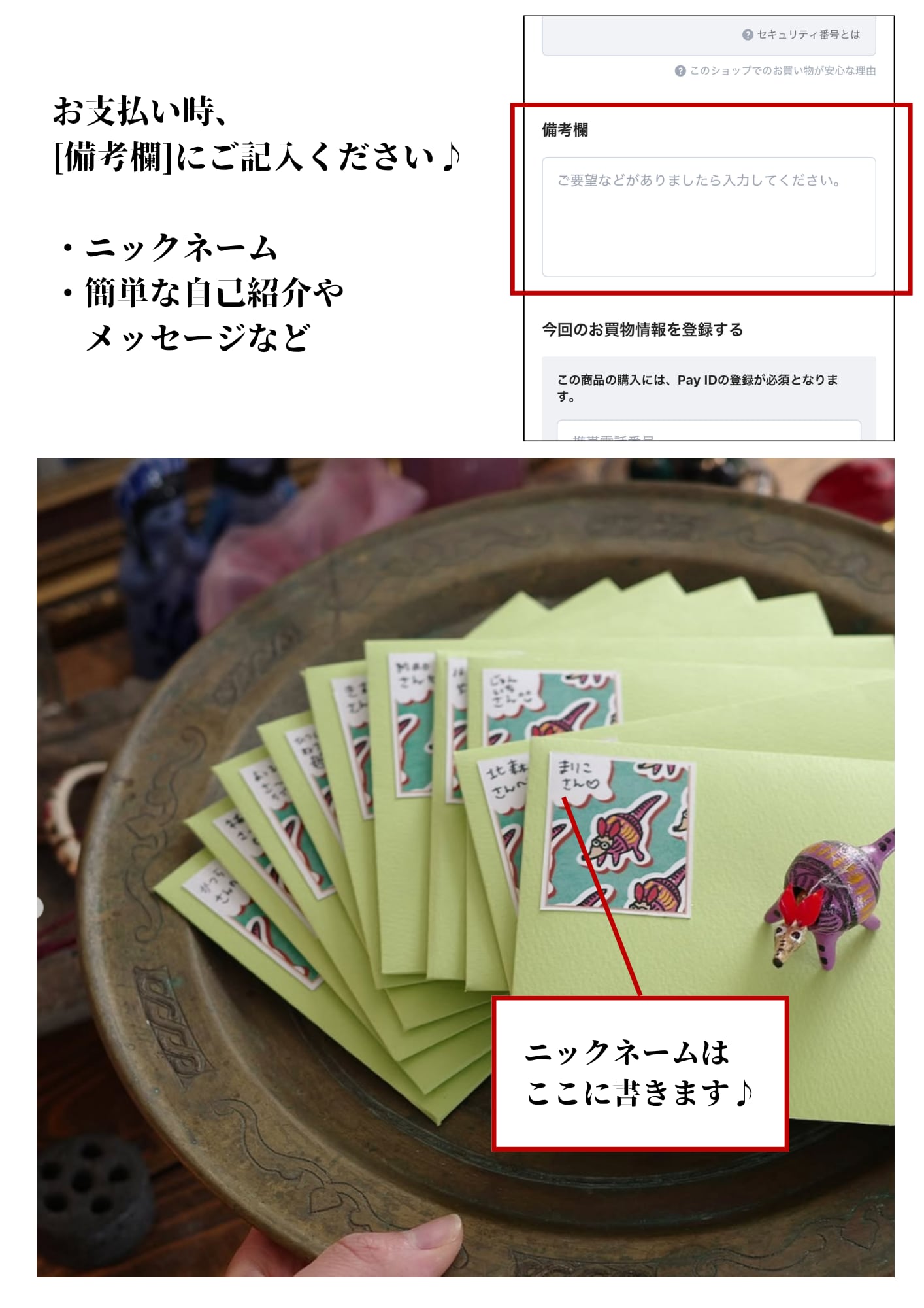 ■お願い:支払画面の[備考欄]に以下をご記入ください♪